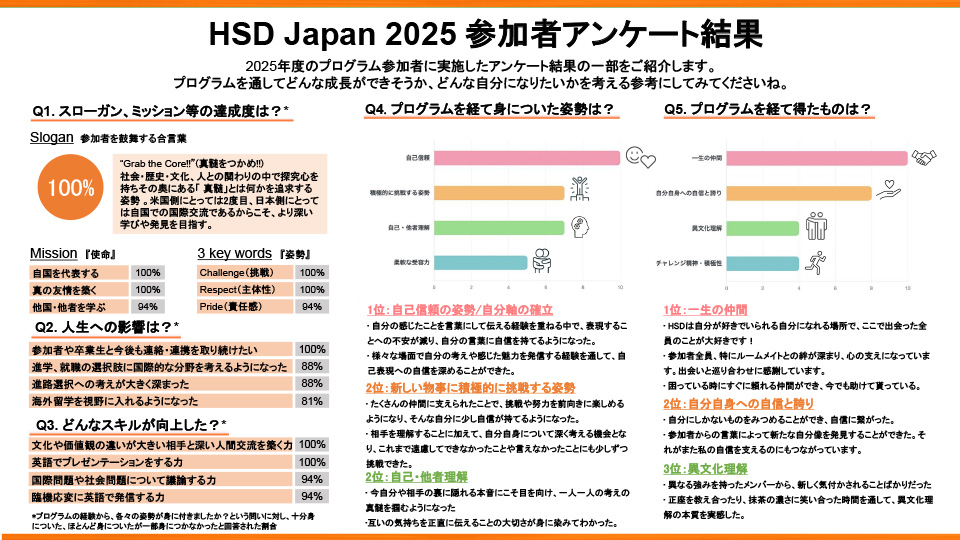 訳:この世界のどこかで誰かあなたの夢を支え、成功と幸せを願っていることを知ることは、目標や成功の前に立ちはだかる壁に立ち向かうための最大の武器だと考える。HSDのメンバーは、私にこの武器を与えてくれた人たちだ。彼らの優しさ、素晴らしいユーモアのセンス、独創性、思いやり、才能、そして何よりも私にとって生涯の友となってくれたこと。そのすべてが大好きだ。こんな素晴らしい人たちに出会わなかった自分の人生は想像できません。(高知県参加者)